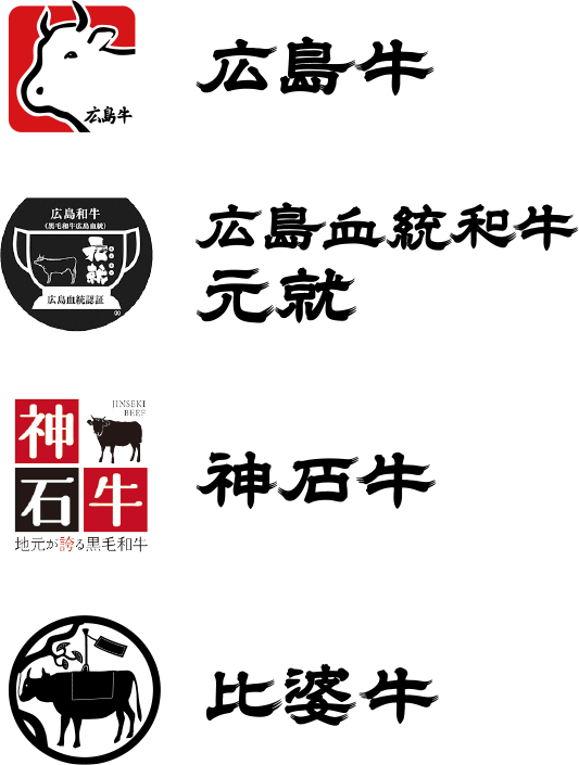 【히로시마 와규】는 모토나리 공의 번영에서 이어지는 혈통을 계승한 「히로시마 혈통 와규 모토나리」, 히로시마 와규의 우수한 잠재력을 겸비한 「히로시마규」, "덩굴소" 혈통에 집착한 희귀 품종인 「히바규」와 「신석규」 이렇게 개성 넘치는 4가지 브랜드 와규로 구성됩니다.