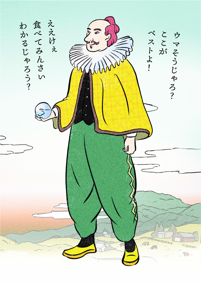 - 언제든지 히로시마 와규를 맛볼 수 있도록 망토 안에는 개인용 나이프와 포크, 조미료를 항상 비치해 두고 있다